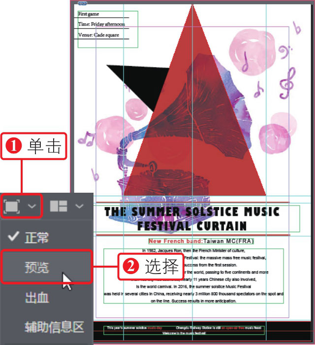 ,②在展开的列表中选择“预览”选项,隐藏参考线,预览海报效果,如下图所示。