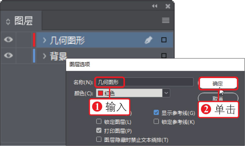 07 打开“图层选项”对话框,①在对话框中输入图层名称为“几何图形”,②单击“确定”按钮,在“图层”面板中创建“几何图形”图层,如下图所示。