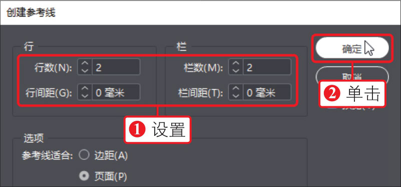 01 执行“文件>新建>文档”菜单命令,新建一个文档,执行“版面>创建参考线”菜单命令,打开“创建参考线”对话框,①在对话框中设置“行数”和“栏数”为2、“行间距”和“栏间距”为0,②设置完成后单击“确定”按钮,如下图所示。