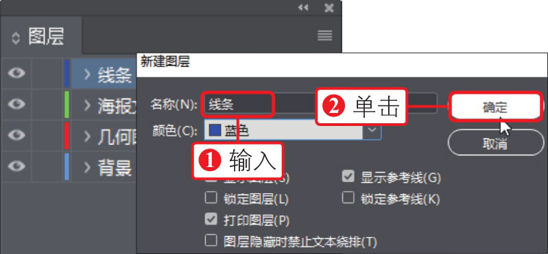15 打开“图层选项”对话框,①在对话框中输入图层名称为“线条”,②单击“确定”按钮,在“图层”面板中创建“线条”图层,如下图所示。