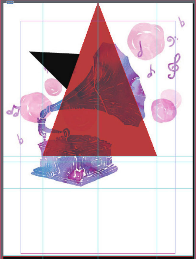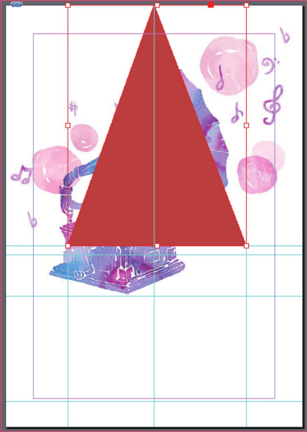 08 选择工具箱中的“钢笔工具”,根据参考线,在文档页面上半部分绘制一个三角形,并将其填充为红色,如下图所示。