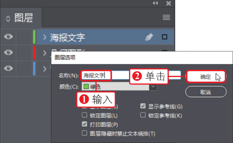 12 打开“图层选项”对话框,①在对话框中输入图层名称为“海报文字”,②单击“确定”按钮,在“图层”面板中创建“海报文字”图层,如下图所示。