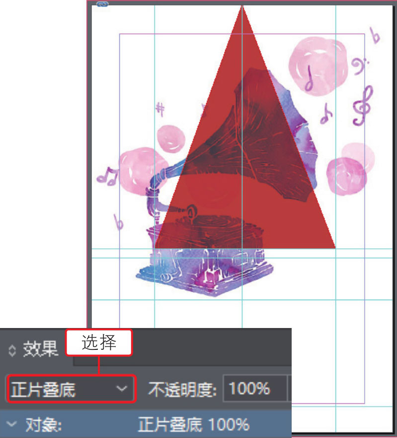09 选中图层中的红色三角形,打开“效果”面板,设置图层混合模式为“正片叠底”,混合图形与背景图像,如下图所示。