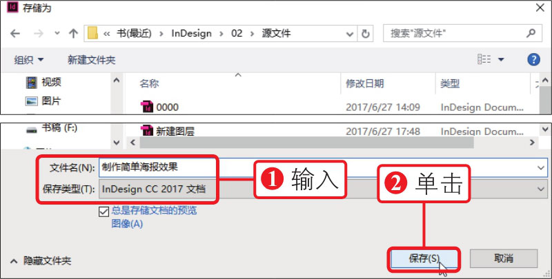 18 执行“文件>存储为”菜单命令,打开“存储为”对话框,①在对话框中输入文件名为“制作简单海报效果”,选择保存类型为“InDesign CC 2017文档”,②单击“保存”按钮,如下图所示,保存文件。