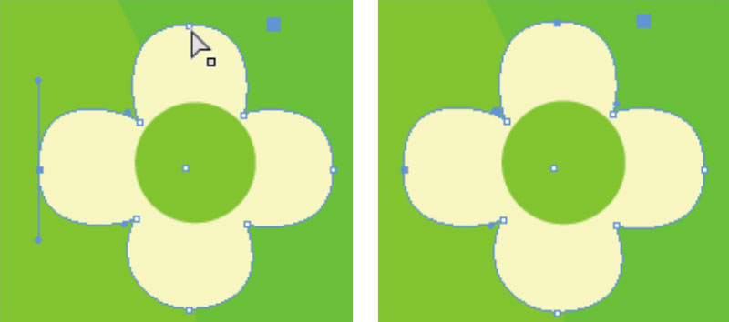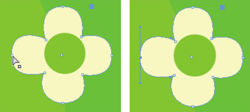 03 选择对象后,如果要选取对象上的单个锚点,将鼠标指针移至节点所在位置,单击后即可选中该节点,选中后能看到旁边的控制手柄,如下图所示。