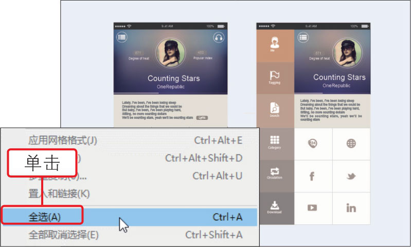 01 打开03.indd,执行“编辑>全选”菜单命令,如下图所示。