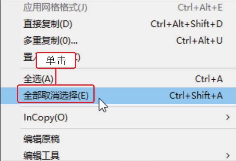 03 执行“编辑>全部取消选择”菜单命令,如下图所示,取消页面中所有对象的选中状态。