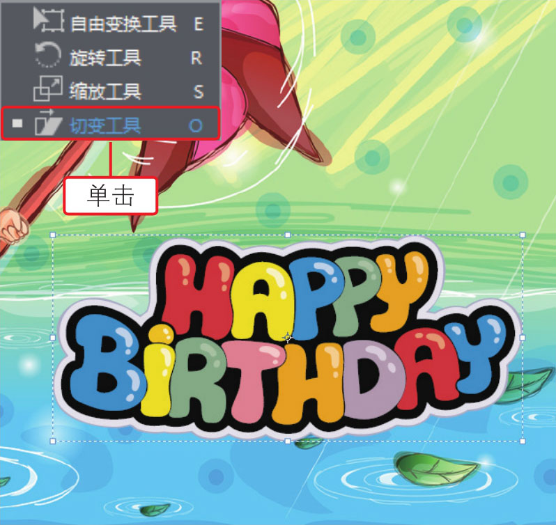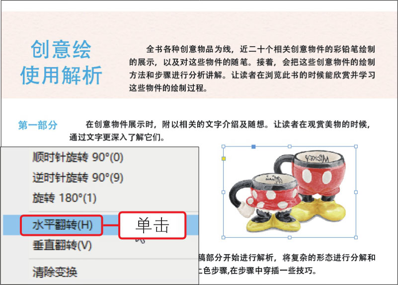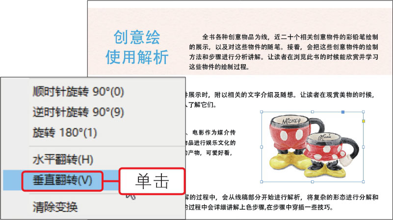 03 右击对象,在弹出的快捷菜单中执行“变换>水平翻转”菜单命令,将选择的对象以水平轴作为参考点翻转,如右图所示。
