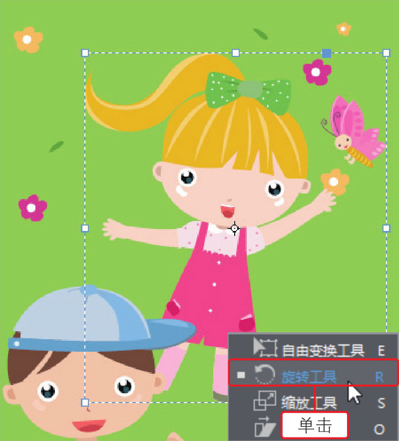 01 打开07.indd,单击工具箱中的“旋转工具”按钮,然后在需要旋转的图形上单击,这时图像的周围将出现变换控制柄及中心参考点,如下图所示。