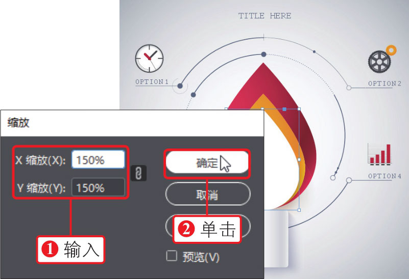 05 执行“对象>变换>缩放”菜单命令,打开“缩放”对话框,①在对话框中的“X缩放”或“Y缩放”数值框中输入百分比值,②输入后单击对话框右上方的“确定”按钮,缩放对象,如下图所示。