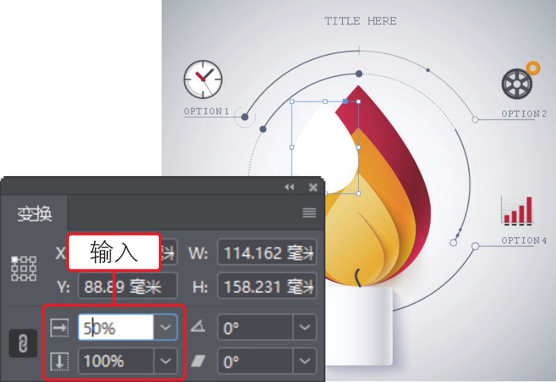 04 选择另一个需要缩放的对象,执行“窗口>对象和版面>变换”菜单命令,打开“变换”面板,在“变换”面板中的“X缩放百分比”或“Y缩放百分比”框中输入百分比值,然后按Enter键,缩放对象,如下图所示。
