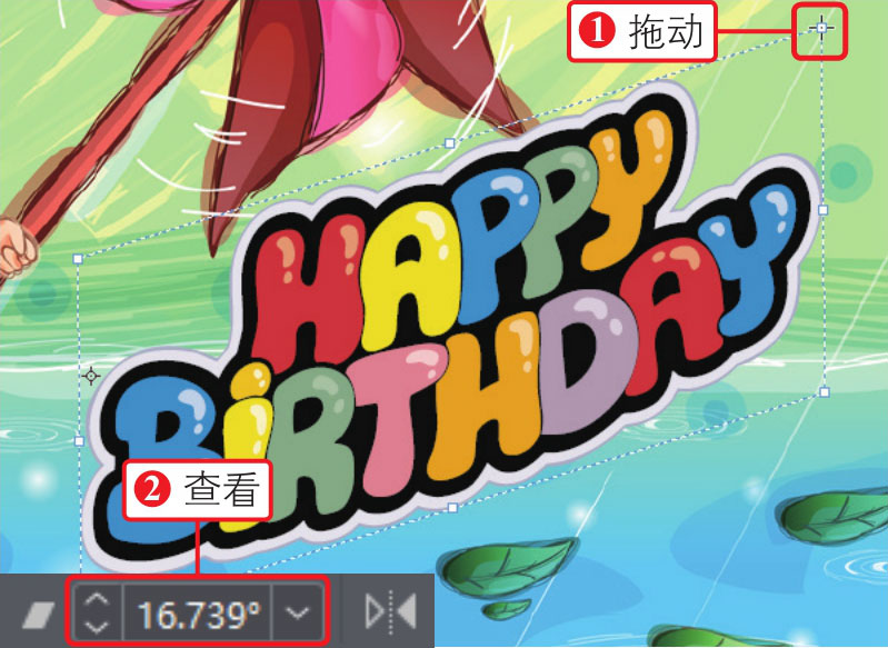 03 将鼠标指针移动至图形右上角位置,①单击并向上拖动至合适角度后释放鼠标,对象将沿垂直轴倾斜,②同时在选项栏中会显示倾斜值,如下图所示。