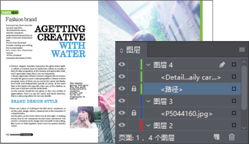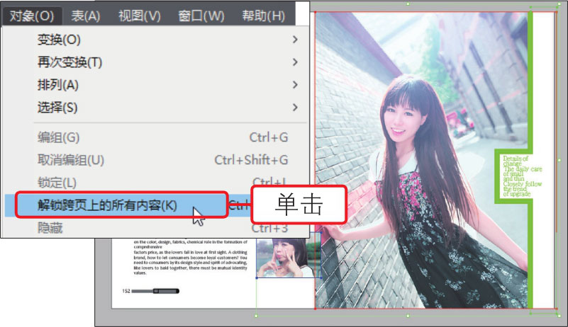 04 解除锁定后,使用“选择工具”选中页面中的人物图像,缩放图像并调整其位置,得到如下图所示的版面效果。