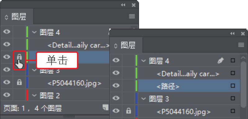01 打开17.indd,打开“图层”面板,单击展开“图层4”图层,可看到“<路径>”前方有锁形图标,表明此对象为锁定状态,不能对该对象进行编辑,如下图所示。