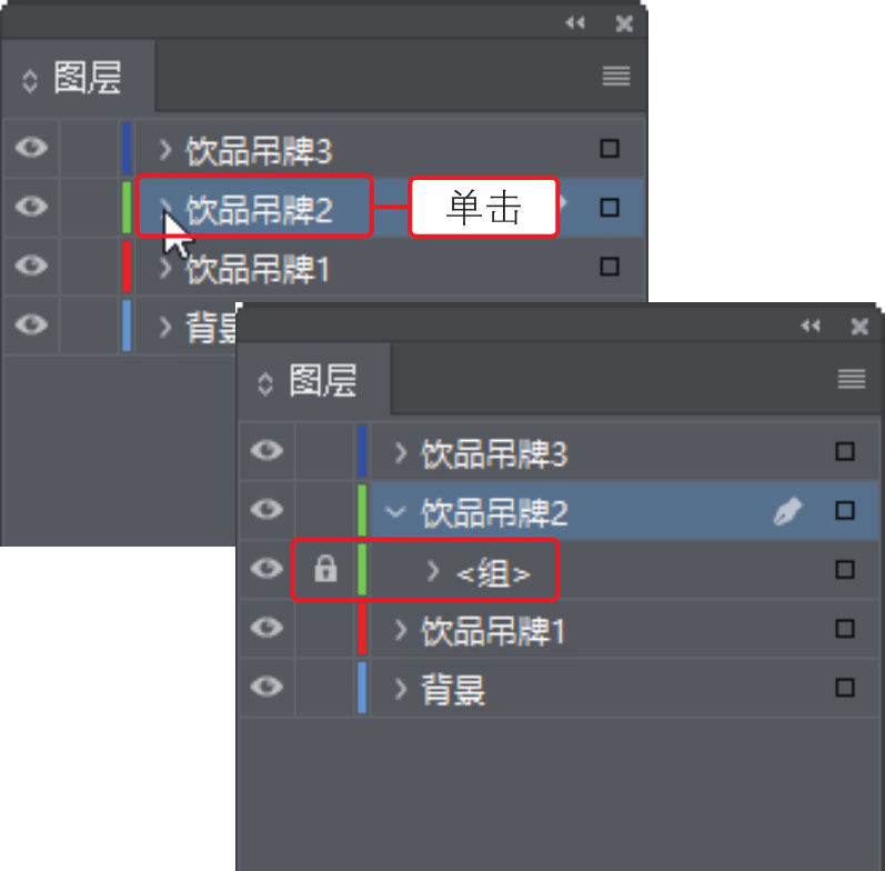 03 锁定对象后,打开“图层”面板,单击图层前面的倒三角形按钮,展开图层,此时可以看到被锁定对象前方会出现锁形图标,如下图所示。