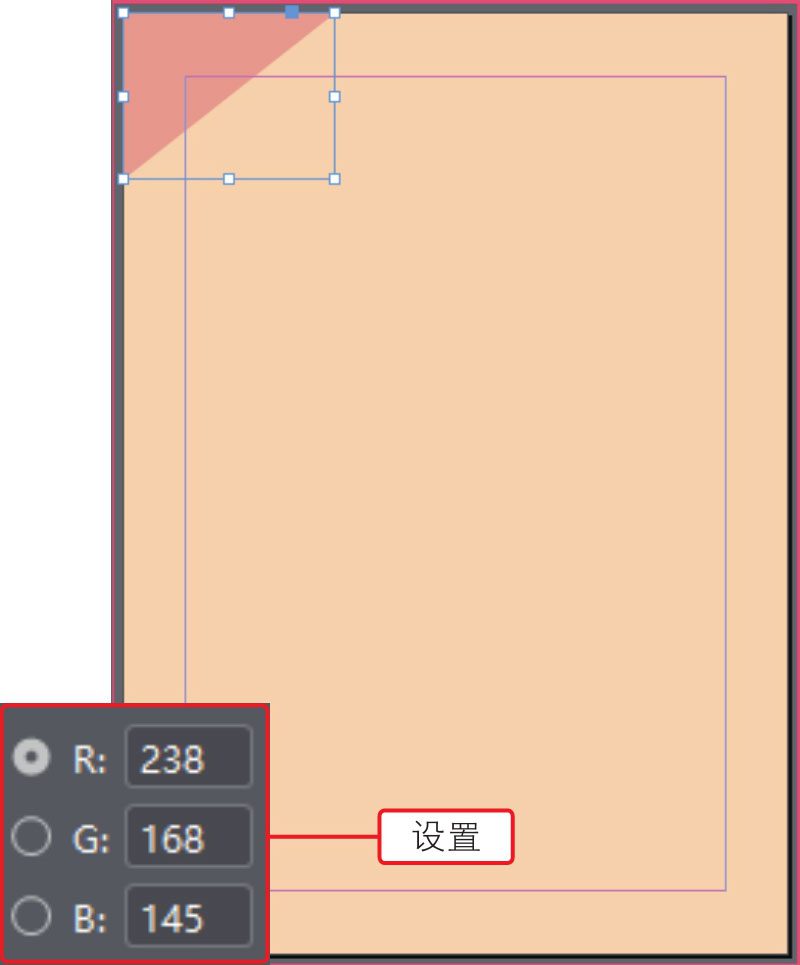 03 使用“钢笔工具”在页面左上角位置绘制三角形,双击“填色”框,打开“拾色器”对话框,设置填充颜色,单击“确定”按钮,填充颜色,如下图所示。