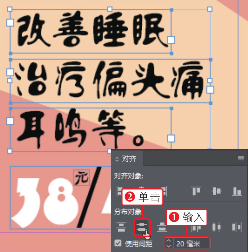 16 打开“对齐”面板,在面板中勾选“使用间距”复选框,1输入间距为20毫米,2单击“垂直居中分布”按钮,将所选对象在垂直方向上进行等距离分布,如下图所示。