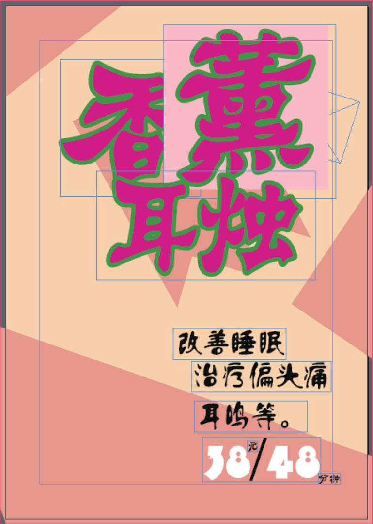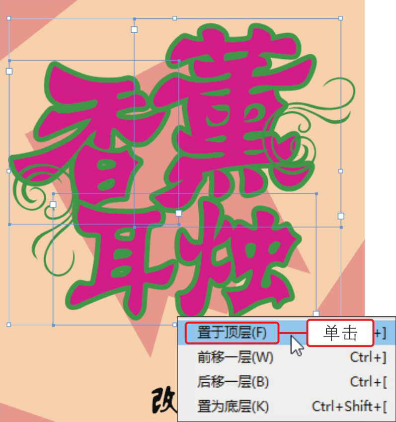 21 按住Shift键不放,使用“选择工具”依次单击选中文本“香”“熏”“耳”“烛”,右击对象,在弹出的快捷菜单中执行“排列>置于顶层”菜单命令,如下图所示。