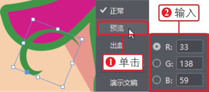 17 ①单击“屏幕模式”按钮,在展开的列表中单击“预览”选项,预览文档,②使用“钢笔工具”绘制花纹图形,双击“填色”框,设置填充颜色,如下图所示。