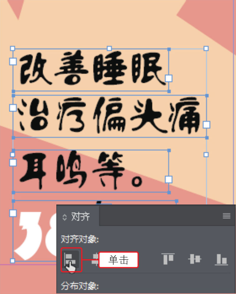 12 执行“窗口>对象和版面>对齐”菜单命令,打开“对齐”面板,在面板中单击“左对齐”按钮,所选文本对象的左边将全部对齐在同一条垂直线上,如下图所示。