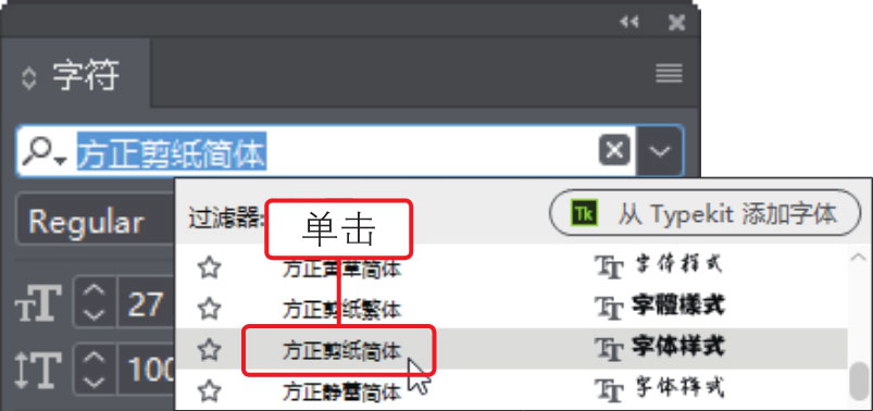 执行“文字>字符”菜单命令,打开“字符”面板,单击面板顶部的“字体系列”下拉按钮