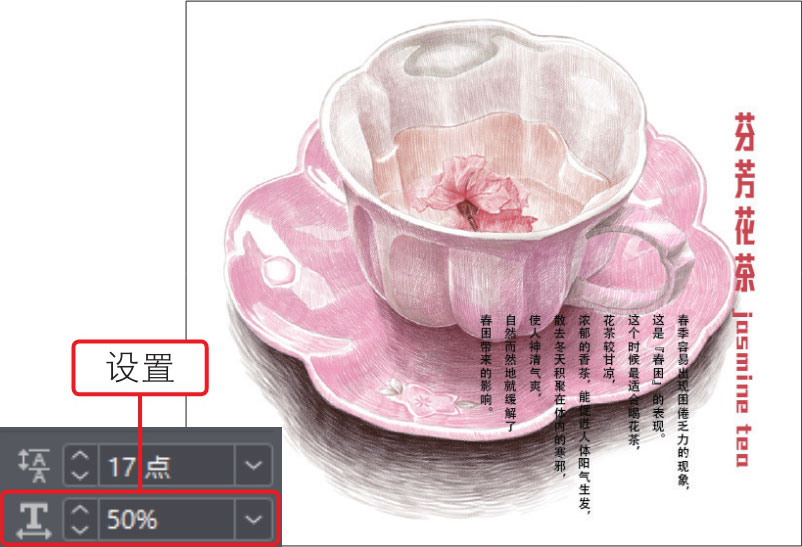 03 在“字符”面板中的“垂直缩放”数值框中输入50%,设置后选中文字将垂直缩放50%,如右图所示。