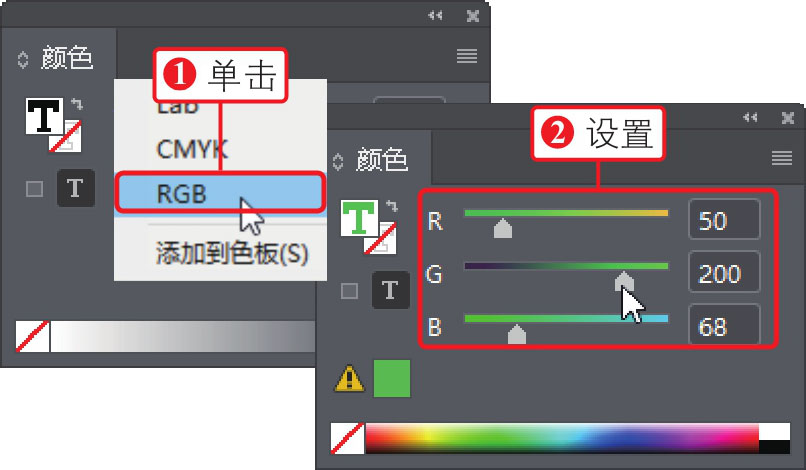 ,①在展开的面板菜单中选择“RGB”选项,②然后拖动下方的颜色滑块,如下图所示。