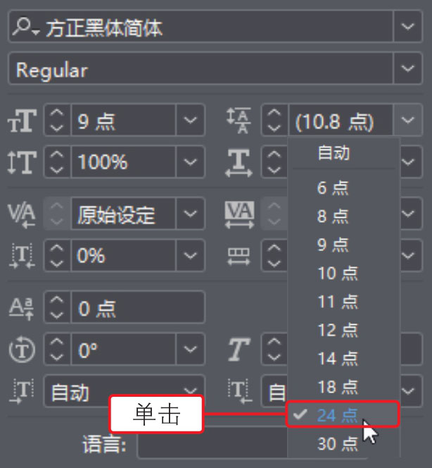 单击“字符”面板中的“字体大小”右侧的下拉按钮