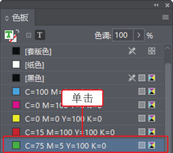 02 执行“窗口>颜色>色板”菜单命令,打开“色板”面板,单击面板中的一种颜色,如下图所示。