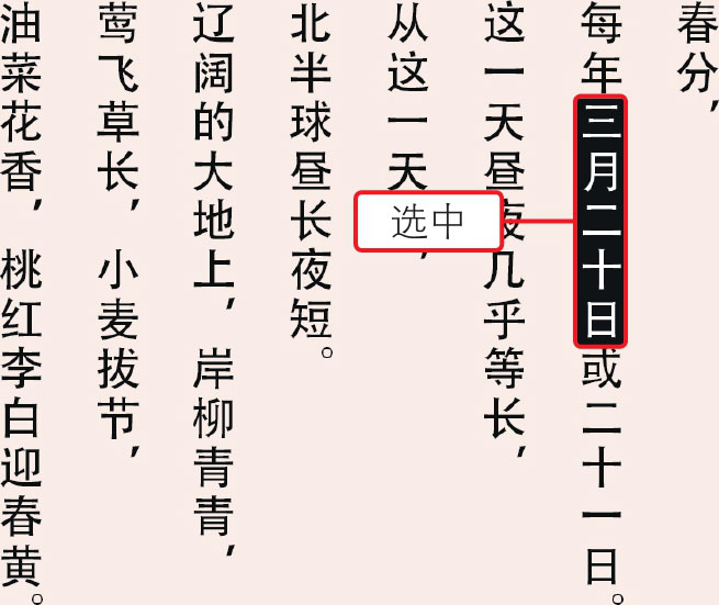 04 确认“文字工具”为选中状态,在文字“三月二十日”上单击并拖动,选中文字,如下图所示。