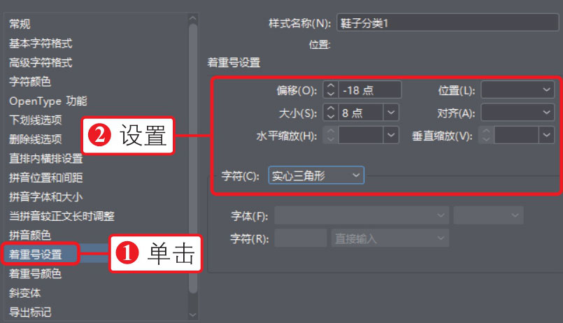 03 若要设置更多的样式,①可以单击左侧的选项标签,如“着重号设置”选项标签,②在展开的相应选项卡中进行样式的设置,如下图所示。