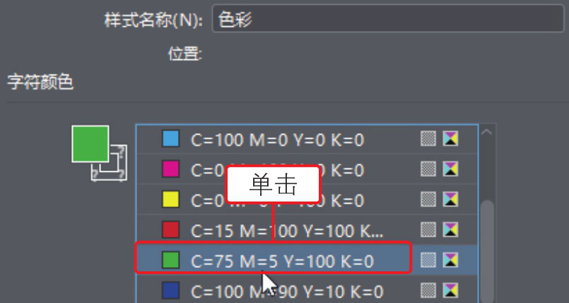 02 打开“字符样式选项”对话框,这里要更改字符颜色,单击“字符标签”标签,在展开的选项卡中单击颜色列表中的绿色,如下图所示。
