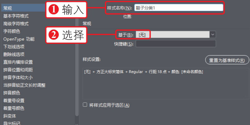 02 打开“新建字符样式”对话框,①在“样式名称”右侧的文本框中输入新样式的名称,②在“基于”下拉列表中选择当前样式所基于的样式,这里无基础样式,因此选择“无”,如下图所示。