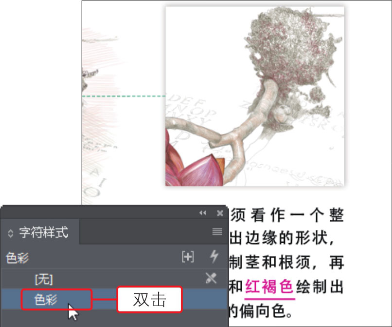 01 打开23.indd,打开“字符样式”面板,双击面板中已创建的“色彩”字符样式,如下图所示。