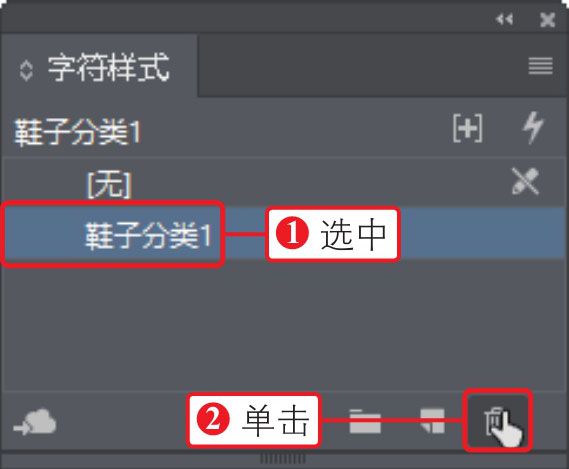 打开“字符样式”面板,①在面板中选中需要删除的字符样式,②单击下方的“删除选定样式/组”按钮