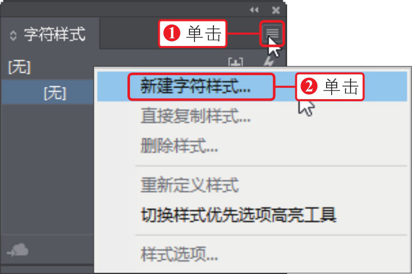 ,②在展开的面板菜单中单击“新建字符样式”命令,如下图所示。