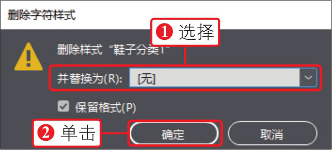 02 打开“删除字符样式”对话框,①在对话框中选择要用来替换前面所选样式的样式,②单击“确定”按钮,如下图所示。