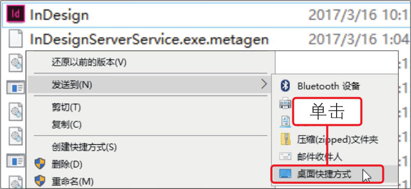 01 在计算机上安装好Adobe InDesignCC程序后,打开已安装应用程序所在的文件夹,选中应用程序图标,右击该图标,执行“发送到>桌面快捷方式”命令,如下图所示。