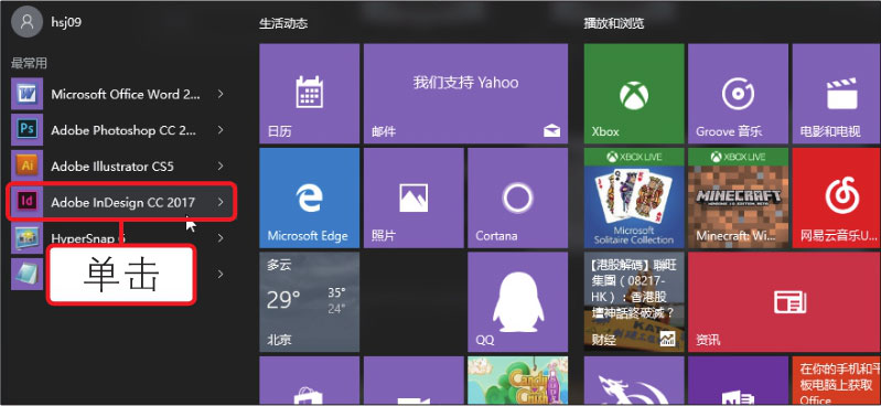 01 单击桌面左下角的“开始”按钮,在展开的列表中单击“Adobe InDe-sign CC 2017”程序,如下图所示。