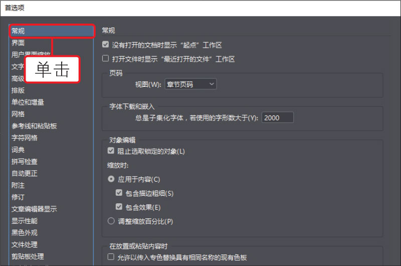 02 打开“首选项”对话框,在对话框中展开“常规”选项卡,在此选项卡下可以设置页码编排方法、缩放框架的内容的行为方式等,如下图所示。