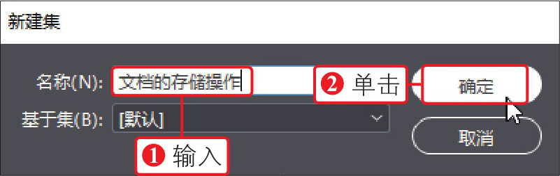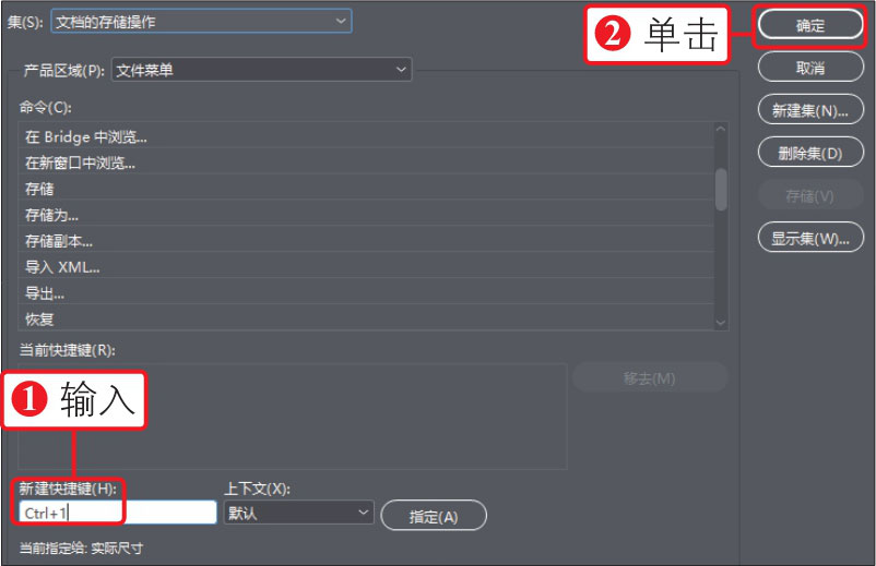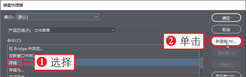 01 执行“编辑>键盘快捷键”菜单命令,打开“键盘快捷键”对话框,①选择“文件菜单”下的“存储”选项,②单击“新建集”按钮,如下图所示。
