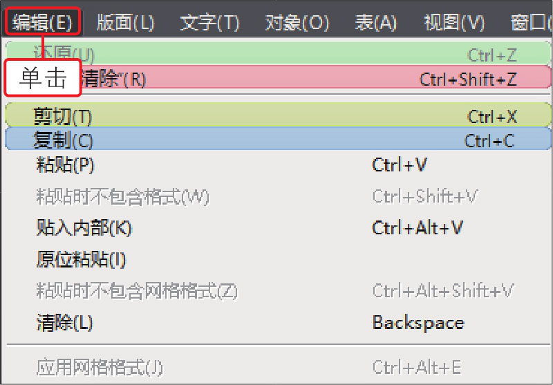02 设置后单击“确定”按钮返回工作界面,此时再单击“编辑”菜单,可以看到定义颜色后的菜单命令效果,如下图所示。