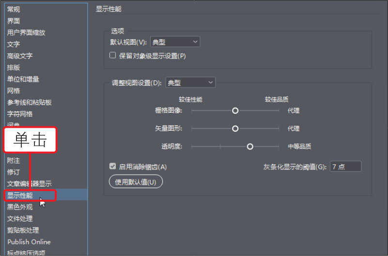 04 单击“首选项”对话框左侧的“显示性能”标签,在展开的“显示性能”选项卡下可以指定默认视图方式、选择启用消除锯齿等,如下图所示。