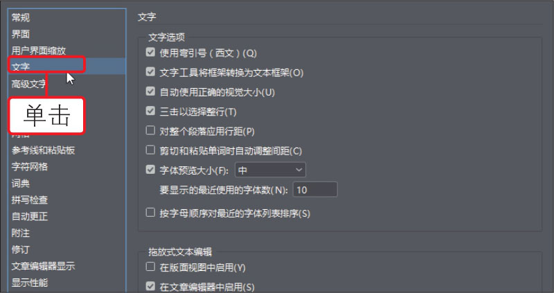 03 单击“首选项”对话框左侧的“文字”标签,展开“文字”选项卡,在该选项卡中可以对文字的处理方式、是否启用拖放文本编辑等进行设置,如下图所示。