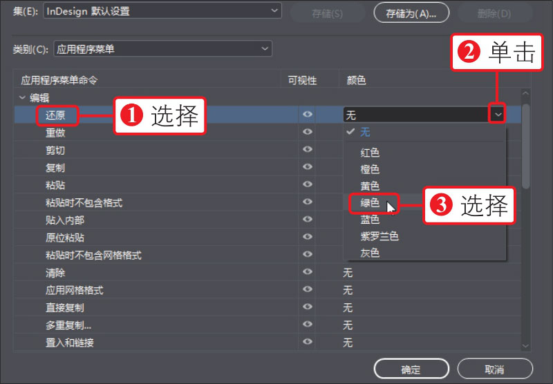 01 执行“编辑>菜单”菜单命令,打开“菜单自定义”对话框,①在对话框中选择“编辑”菜单下的“还原”命令,②单击右侧的“颜色”下拉按钮,③选择“绿色”命令,如下图所示,使用同样的方法为更多菜单命令着色。