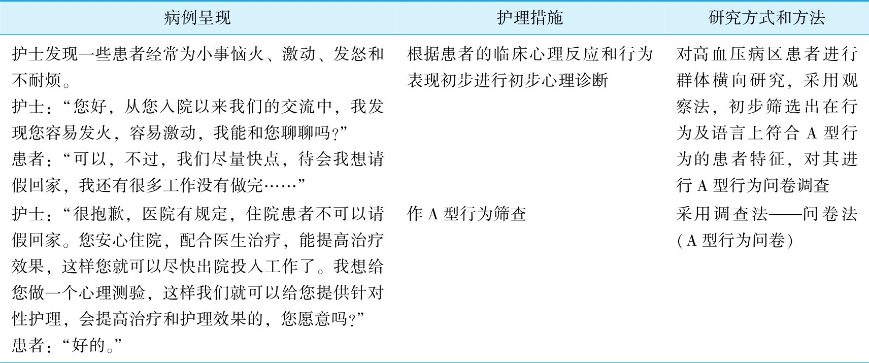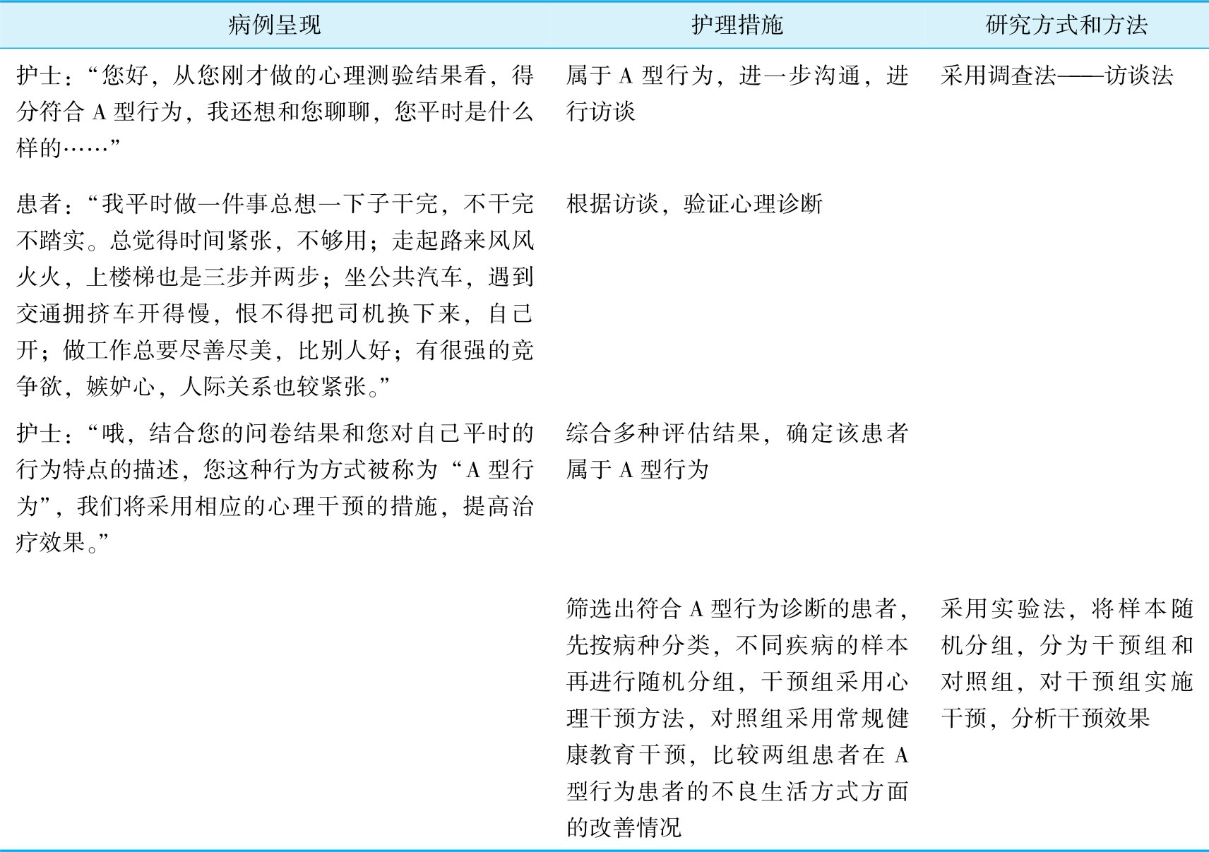 3.模拟实验法(Simulated experiment) 指按照研究需要,人为设计某种模拟真实情境的实验场所,以探求人们心理活动发生及变化规律的研究方法。如设计模拟的护患交流情境,请有关人员扮演患者,观察护理人员的人际沟通能力。模拟实验,虽是人为设计,但对被研究对象来说,若未觉察是人为情境,所产生的心理反应实际上真实的。因此,模拟情境设计应尽可能做到逼真。在护理心理学课堂教学活动中,教师可以和护生共同设计模拟情境,共同制定脚本,创设护理情境,让护生分别扮演护理人员、患者和家属等,完成模拟情境表演,能提高护生的护理能力。在临床护理工作中,研究者会根据研究需要选择研究方式和方法,下面以心内科案例演示护理人员对研究方式和方法的选择及应用过程(表1-2):护理人员发现心内科病房为数不少的住院患者经常为小事闹情绪、激动甚至发怒。以护士对此心理现象的了解,认为可能与患者的个性有关。护理人员计划通过心理评估,判断这类患者是否属于A型行为性格,如果可以确定,则按高血压病和冠心病等不同种疾病分类,对不同病种的研究对象进行随机分组、心理干预,评价干预效果。