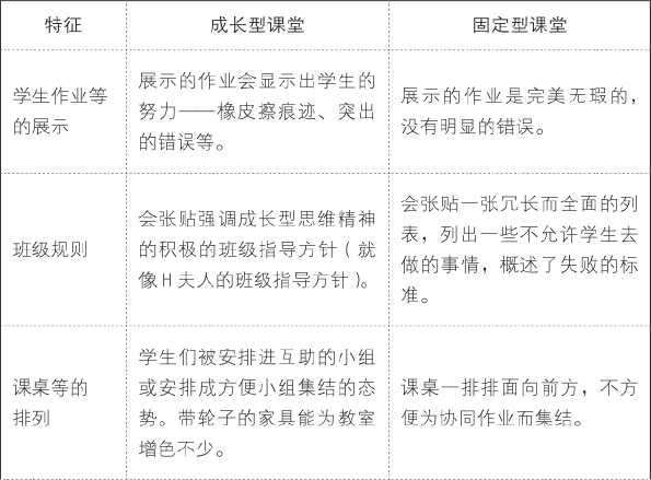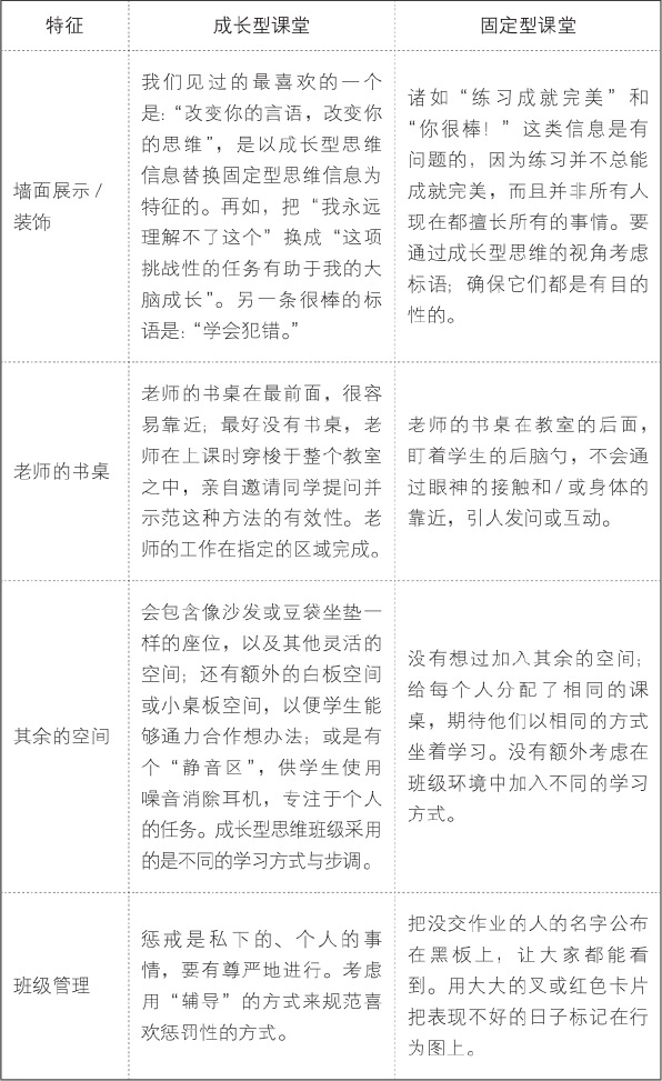 成长型思维的班级空间环境应传达出努力是有价值的信息。它应能诱发大家去承担风险、克服挑战,并要向学生们传达出,这是一个可供提问与犯错的安全空间。成长型思维的班级空间环境应该珍视挑战——迎接挑战难免会遭遇失败——永远不要重视完美胜于重视努力。