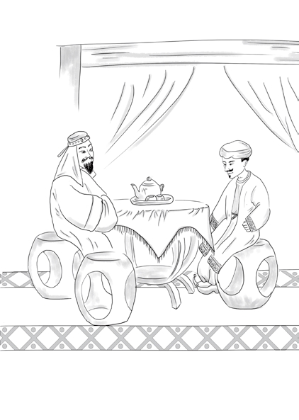 大人神情焦虑严肃,从垫上起身,在房中来回踱步,然后面色更凝重了:“听到这番话,我十分沮丧,心情非常低落。可是有天我去拜访吾友大商人纳瑟耳,却听见他不断热情赞誉某位新从波斯来到巴格达的运算家。我听到了那8条面包的故事,包括所有细节,留下极为深刻鲜明的印象。所以我四下去找这位数数的人,又特地前往玛勒夫府上去会他。在那里,我看见他别具一格地解快了257头骆驼的问题,把它们减成256头,简直叹为观止!您还记得吗?”