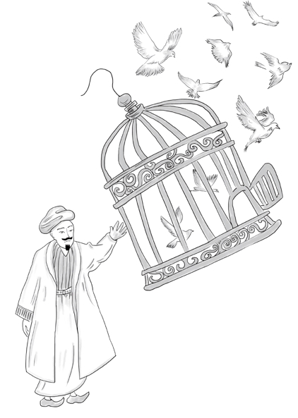 “每当我们放出一只笼中鸟,”撒米尔解释,“就等于做了三件爱心善行。第一件是对那只小小鸟儿,使它回归当初被攫之前的自由。第二件是对我们自己的良心。第三件是对真主……”