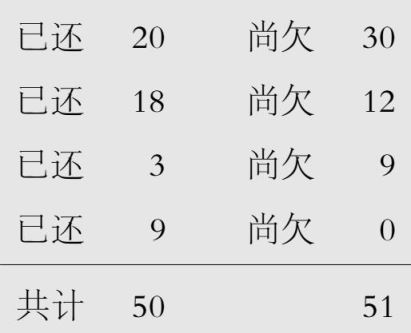 “请留意第一栏总数是50—和前一个情况相同—可是另一栏的和却是51了。显然不对,不可能会这样。可是我不晓得怎么解释,为什么第二种还钱法会出现这种差异。我知道自己并没有被骗,因为借出去的钱全收回来了。可是为什么第一个例子的总和是50,第二个例子的总和却变成51,怎么解释这个不同呢?”